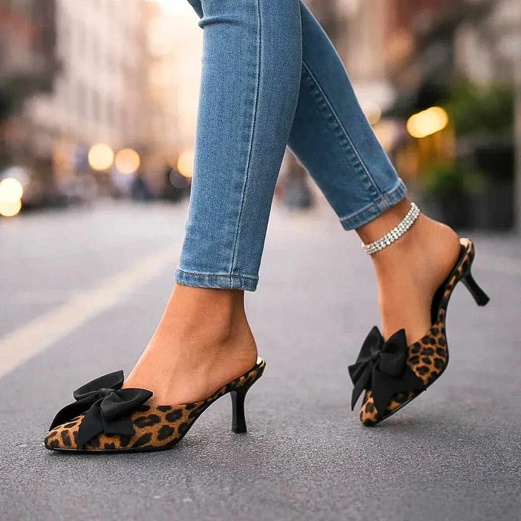 Bold yet beautifully feminine, these kitten heels feature a striking leopard print and sculpted bow detail that adds playful sophistication to every step.  A cushioned footbed keeps them comfortable from day to night, while the mule style finish allows for easy slip-on access.