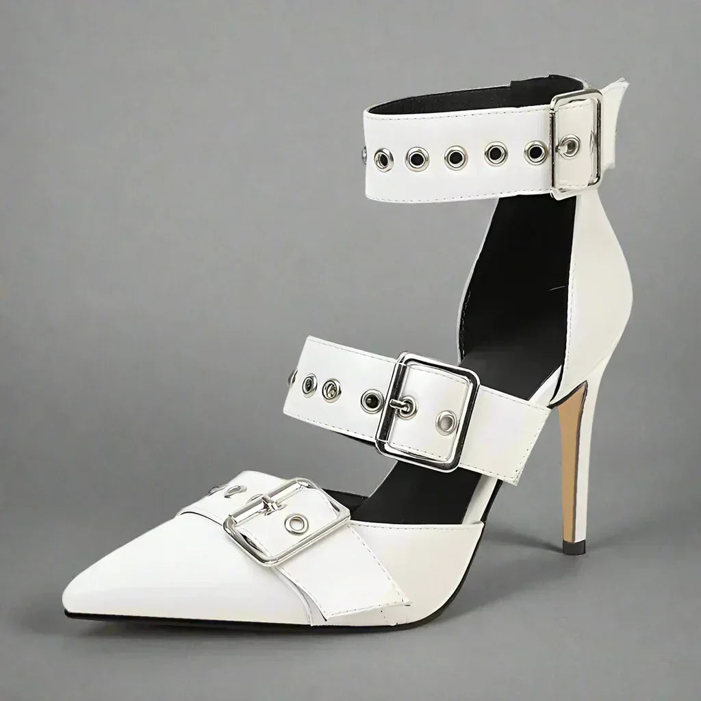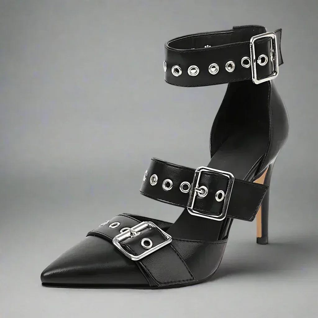 Crafted from premium leather and infused with bold flair, these stilettos embody striking confidence in every step.  Adjustable metallic buckle straps ensure a personalized fit, while cushioned insoles and no-stress arch support deliver comfort without compromise.  A standout from the Ravyn Heights Collection, they merge statement style with everyday wearability.