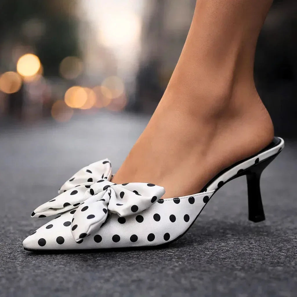 Blending playful detail with modern charm, these kitten heels feature a soft oversized bow and timeless polka-dot pattern for a look that's both graceful and distinctive. A sculpted low heel and cushioned insole provide gentle comfort, while the mule design allows for effortless slip on wear.